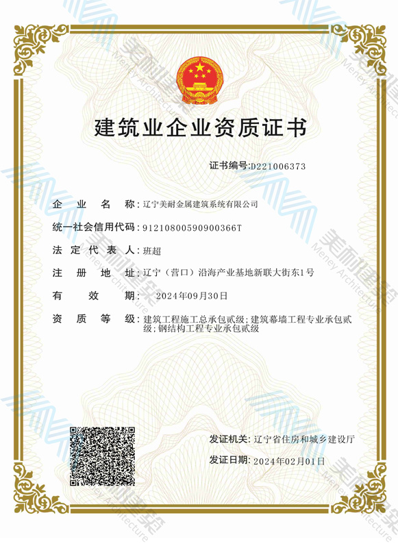 遼寧美耐金屬建筑系統(tǒng)有限公司位于遼寧(營口)沿海產(chǎn)業(yè)基地,專注于預制金屬建筑系統(tǒng)領域,是一家集工業(yè)建筑設計、制作、施工及相關的技術(shù)咨詢與服務為一體的綜合性服務企業(yè)。作為國家鋼結(jié)構(gòu)協(xié)會會員、中國建筑金屬結(jié)構(gòu)協(xié)會會員單位與國家高新技術(shù)企業(yè),美耐建筑集建筑工程施工總承包、鋼結(jié)構(gòu)工程專業(yè)承包等多種資質(zhì)于一身,并擁有22項鋼結(jié)構(gòu)建筑領域?qū)@?項軟件著作權(quán)。